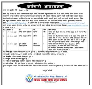 किसान लघुवित्तले कम्पनीले केही सङ्ख्यामा र कनिष्ठ अधिकृतसहित ७ जना कर्मचारी माग गरेको छ । साथै मुख्य अधिकृत सहायक प्रबन्धकमा एकजना कर्मचारी माग गरेको हो ।